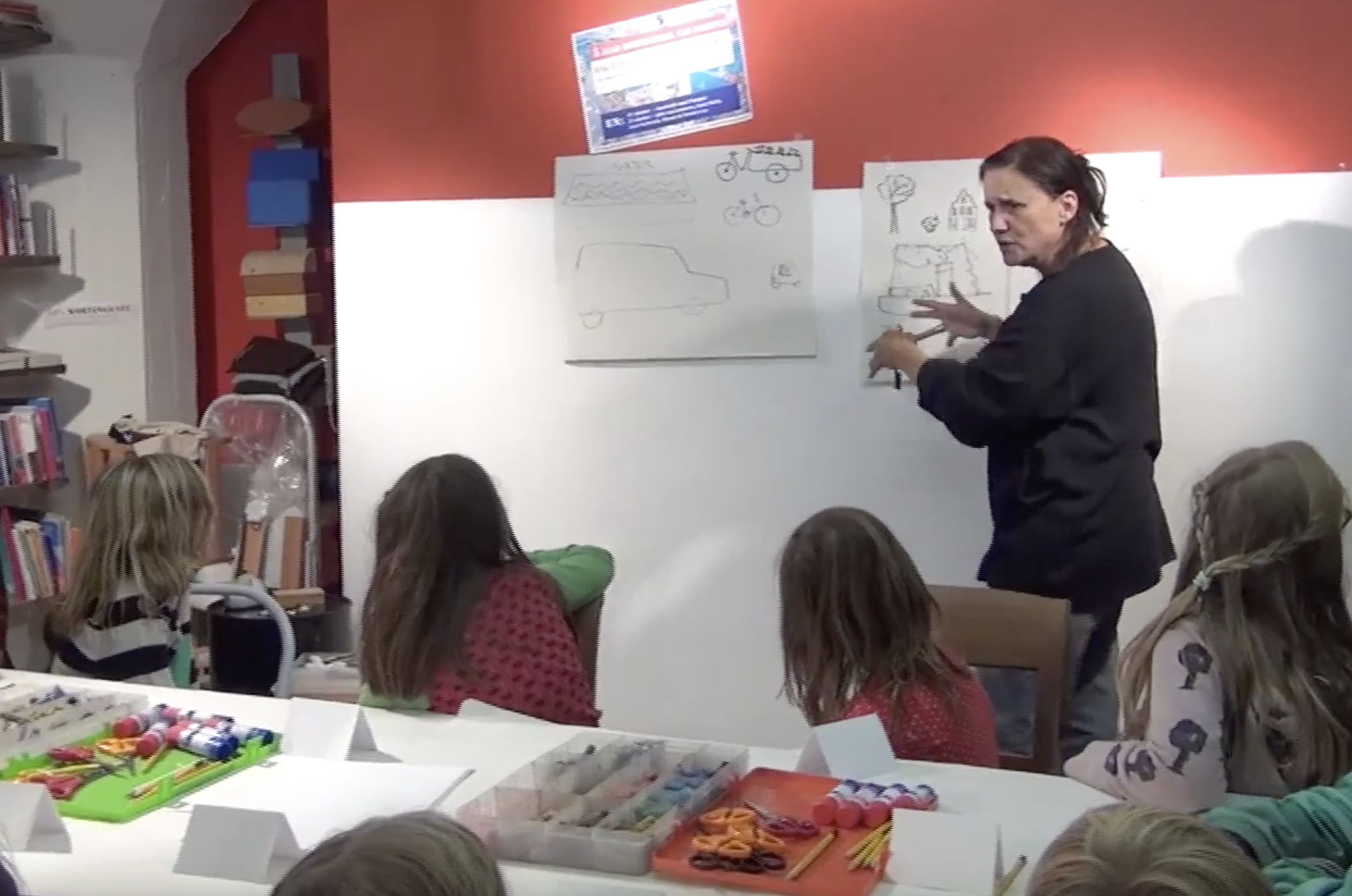 Jowi verzint mét de kids een spannend verhaal en Steffie tekent dat uit met de kids, op de achterwand.